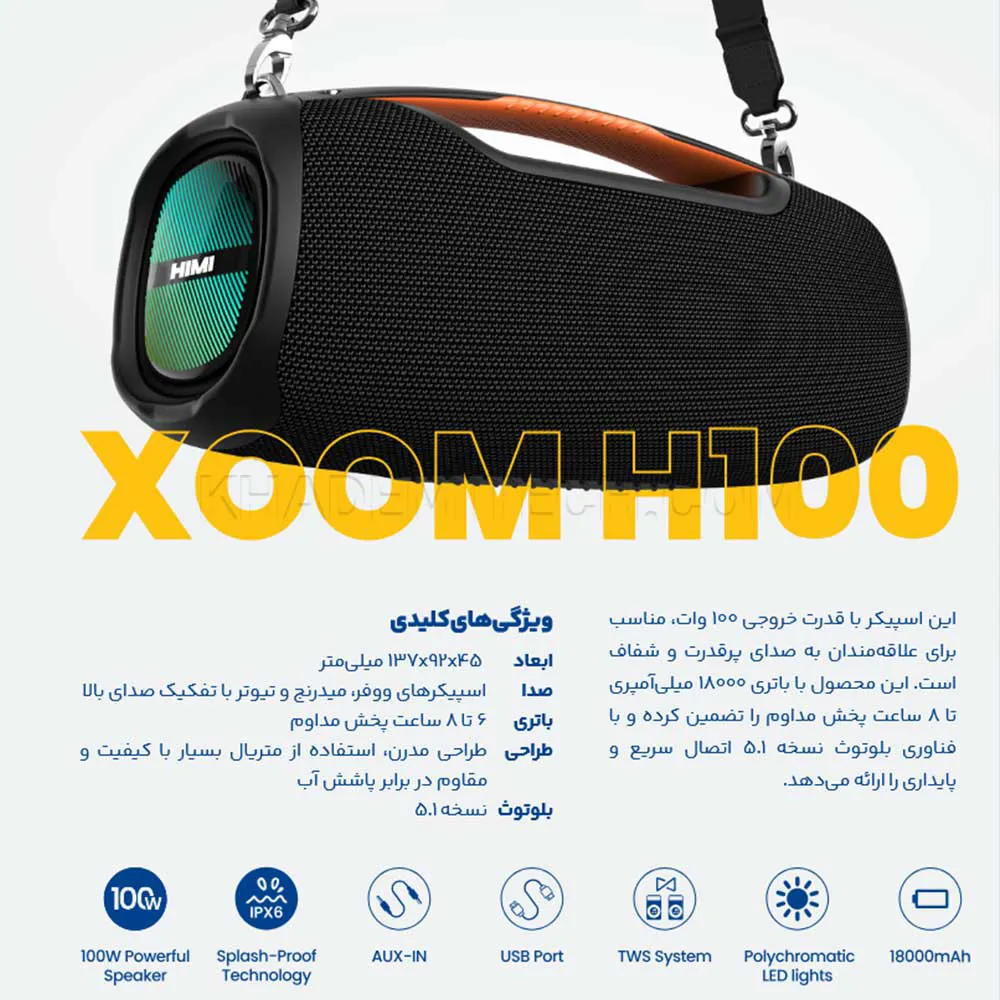 113006363اسپیکر قابل حمل HIMI Xoom H100 یک بلندگوی بلوتوثی قدرتمند است که برای استفاده در فضای باز، مهمانیها و دورهمیها طراحی شده است.توان صوتی: این اسپیکر با قدرت خروجی ۱۰۰ وات، صدایی بلند، واضح و باس (Bass) عمیق را ارائه میدهد که برای پوشش دادن فضاهای بزرگ مناسب است.