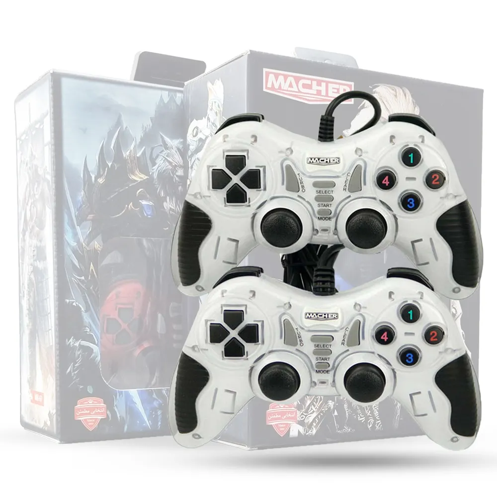 دسته بازی کامپیوتر دوبل حرفه ای Macher مدل MR-61 از نوع فانتزی و رنگ بندی متنوع با ظاهری مدرن و زیبا در بسته بندی دوتایی مناسب برای بازی های رایانه ای، مخصوص گیمرهای حرفه ای و علاقمندان و اشخاصی که حرفه ای بازی های رایانه ای را دنبال میکنند.گیم پد ها وسیله مهم و با ارزش برای گیمرها بوده و آنها بدنبال دسته های هستند که جدای از زیبایی دارای عملکرد های سریع و کارکرد های متنوع و سریع باشند. در اینجا دسته بازی کامپیوتر دوبل حرفه ای Macher مدل MR-61 علاوه بر طراحی بسیار زیبا و ارگونومی به دلیل ابعاد و وزن متعادل دسته های خود در زمان استفاده طولانی مدت از خستگی و آسیب به دست جلوگیری میکند.از مشخصات ظاهری این گیم پد دوبل شوک دار مچر وجود چرم های مهندسی که علاوه بر شکیل شدن دسته، متناسب بودن و همچنین روی قسمت قرار گیری کف دست این دسته بازی پوشش سیلیکونی تعبیه شده است که تا حد زیادی جلوی خستگی دست و مشکلاتی مانند عرق کردن کف دست را میگیرد. همچنین MR61 شامل 19 کلید اصلی (4 کلید رنگی در سمت راست بعلاوه 4 کلید جهت دار در سمت چپ، چهار کلید کمکی در شانه ها و دو کنترلر آنالوگ 360 درجه) همچنین 5 کلید کمکی شامل ( Clear/turbo/Mode/Select/Start) در قسمت جلو بر روی گیم پد قرار داده شده است و برای کمک به بازی کننده برای متوقف کردن و فعال و یا غیرفعال کردن شک دسته به بکار رفته است.این جوی استیک مچر دارای دو موتور شوک بسیار قوی و قدرتمند می باشد و سیستم ویبره آن باعث میشود در هنگام بازی های اکشن هیجان بازی دو چندان شود. این محصول مناسب برای انواع کامپیوتر و پشتیبانی از بیشتر سیستم عاملهای ویندوز۹۸/۲۰۰۰/ME/NT/XP/Vista/7 و قابلیت اتصال بوسیله سیمی به طول 1.5 متر بدون نیاز به هیچ گونه نصب و راه اندازی به USB دستگاه شما متصل میشود.
