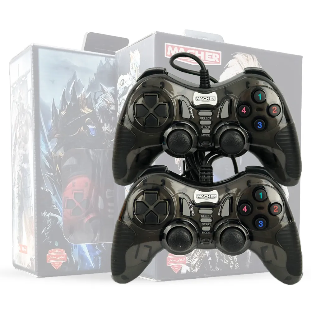دسته بازی کامپیوتر دوبل حرفه ای Macher مدل MR-61 از نوع فانتزی و رنگ بندی متنوع با ظاهری مدرن و زیبا در بسته بندی دوتایی مناسب برای بازی های رایانه ای، مخصوص گیمرهای حرفه ای و علاقمندان و اشخاصی که حرفه ای بازی های رایانه ای را دنبال میکنند.گیم پد ها وسیله مهم و با ارزش برای گیمرها بوده و آنها بدنبال دسته های هستند که جدای از زیبایی دارای عملکرد های سریع و کارکرد های متنوع و سریع باشند. در اینجا دسته بازی کامپیوتر دوبل حرفه ای Macher مدل MR-61 علاوه بر طراحی بسیار زیبا و ارگونومی به دلیل ابعاد و وزن متعادل دسته های خود در زمان استفاده طولانی مدت از خستگی و آسیب به دست جلوگیری میکند.از مشخصات ظاهری این گیم پد دوبل شوک دار مچر وجود چرم های مهندسی که علاوه بر شکیل شدن دسته، متناسب بودن و همچنین روی قسمت قرار گیری کف دست این دسته بازی پوشش سیلیکونی تعبیه شده است که تا حد زیادی جلوی خستگی دست و مشکلاتی مانند عرق کردن کف دست را میگیرد. همچنین MR61 شامل 19 کلید اصلی (4 کلید رنگی در سمت راست بعلاوه 4 کلید جهت دار در سمت چپ، چهار کلید کمکی در شانه ها و دو کنترلر آنالوگ 360 درجه) همچنین 5 کلید کمکی شامل ( Clear/turbo/Mode/Select/Start) در قسمت جلو بر روی گیم پد قرار داده شده است و برای کمک به بازی کننده برای متوقف کردن و فعال و یا غیرفعال کردن شک دسته به بکار رفته است.این جوی استیک مچر دارای دو موتور شوک بسیار قوی و قدرتمند می باشد و سیستم ویبره آن باعث میشود در هنگام بازی های اکشن هیجان بازی دو چندان شود. این محصول مناسب برای انواع کامپیوتر و پشتیبانی از بیشتر سیستم عاملهای ویندوز۹۸/۲۰۰۰/ME/NT/XP/Vista/7 و قابلیت اتصال بوسیله سیمی به طول 1.5 متر بدون نیاز به هیچ گونه نصب و راه اندازی به USB دستگاه شما متصل میشود.104040