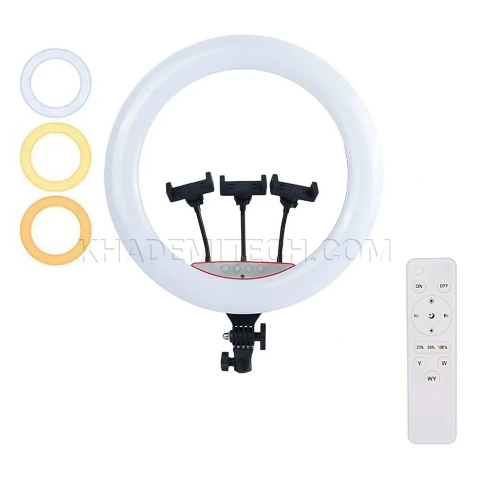 - این رینگ لایت دارای پایه کوتاه و مقاوم فلزی است که امکان تنظیم زاویه نور تا ۱۸۰ درجه را فراهم میکند. همراه آن یک ریموت کنترل ارائه شده که قابلیت تنظیم شدت روشنایی، دمای رنگ (از ۳۲۰۰ تا ۵۵۰۰ کلوین) و کنترل لامپهای زرد و سفید را دارد. مناسب برای عکاسی با نور قابل تنظیم.