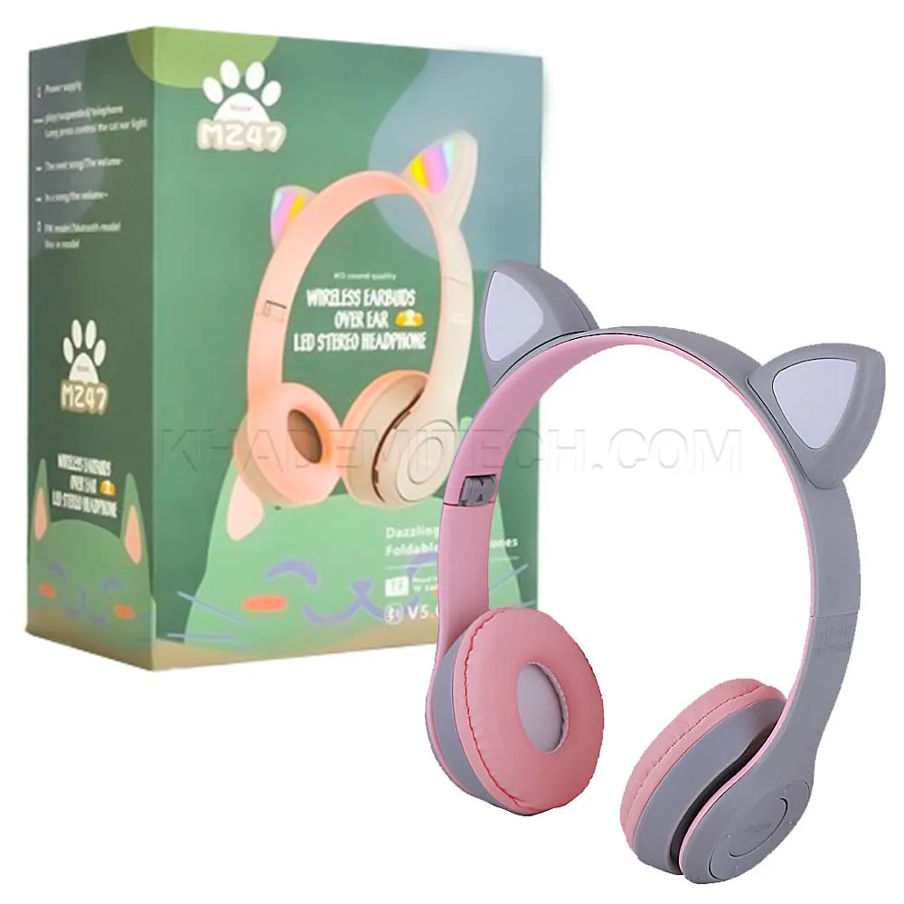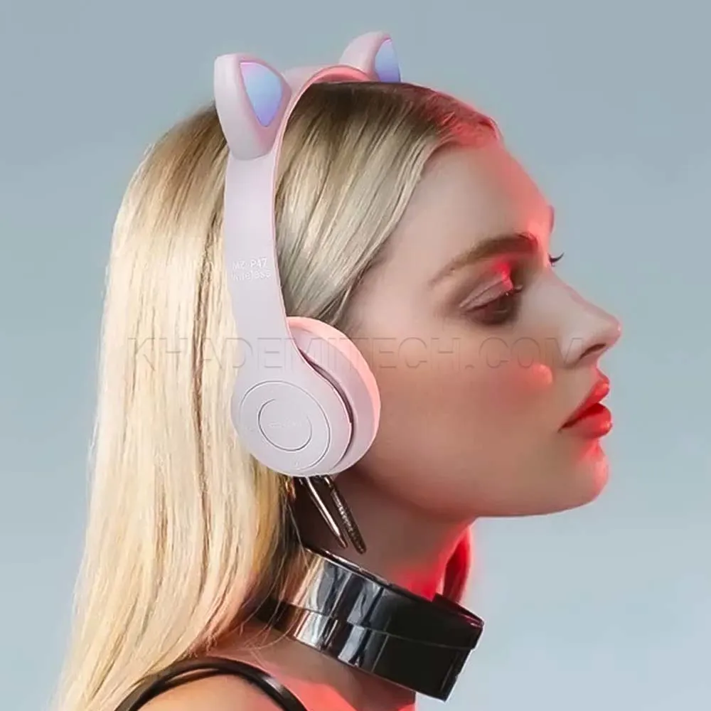 هدست بلوتوثی رم خور مدل MZ47 گربه ای طوسی صورتی | اپل3