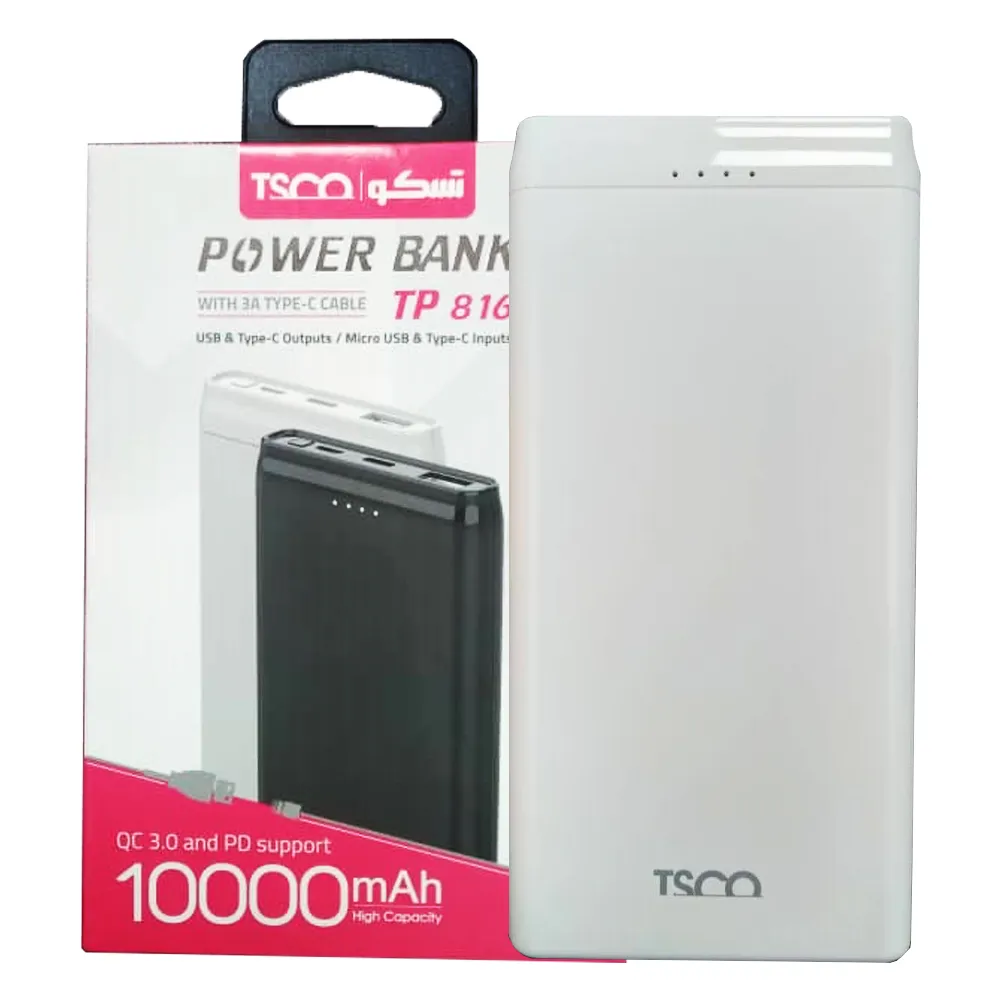 پاوربانک یا شارژر همراه تسکو مدل TP 816 ظرفیت 10000 میلی آمپر ساعت یک پاوربانک بسیار قدرتمند با مشخصات فنی کامل و طراحی بسیار زیبا دارد. در بالای پاوربانک یک قسمت وجود دارد که چهار LED برای نشاندادن میزان شارژ در آن کار گذاشتهشده است. شارژر همراه تسکو مدل TP 816 ظرفیت 10000 میلی آمپر ساعت، میتواند مدت طولانی کاربر را از شارژ بینیاز سازد. در این پاوربانک 3 درگاه وجود دارد که یک عدد از آنها USB 2.0، یکی دیگر USB-C و دیگری microUSB هستند. USB-C و microUSB در این پاوربانک فقط برای شارژ شدن خود شارژر همراه با ولتاژ 5 و 2 آمپر است. ما با استفاده از این پاوربانک فقط میتوانیم از USB 2.0 تا 5V,3A/ 9V,2A/12V,1.5A (QC) و تایپ C تا 5V,3A/ 9V,2A/ 12V ,1.5A(PD) آن شارژ دریافت کنیم. شارژر همراه تسکو مدل TP 816 دارای یک کابل تایپ سی 3 آمپر است.