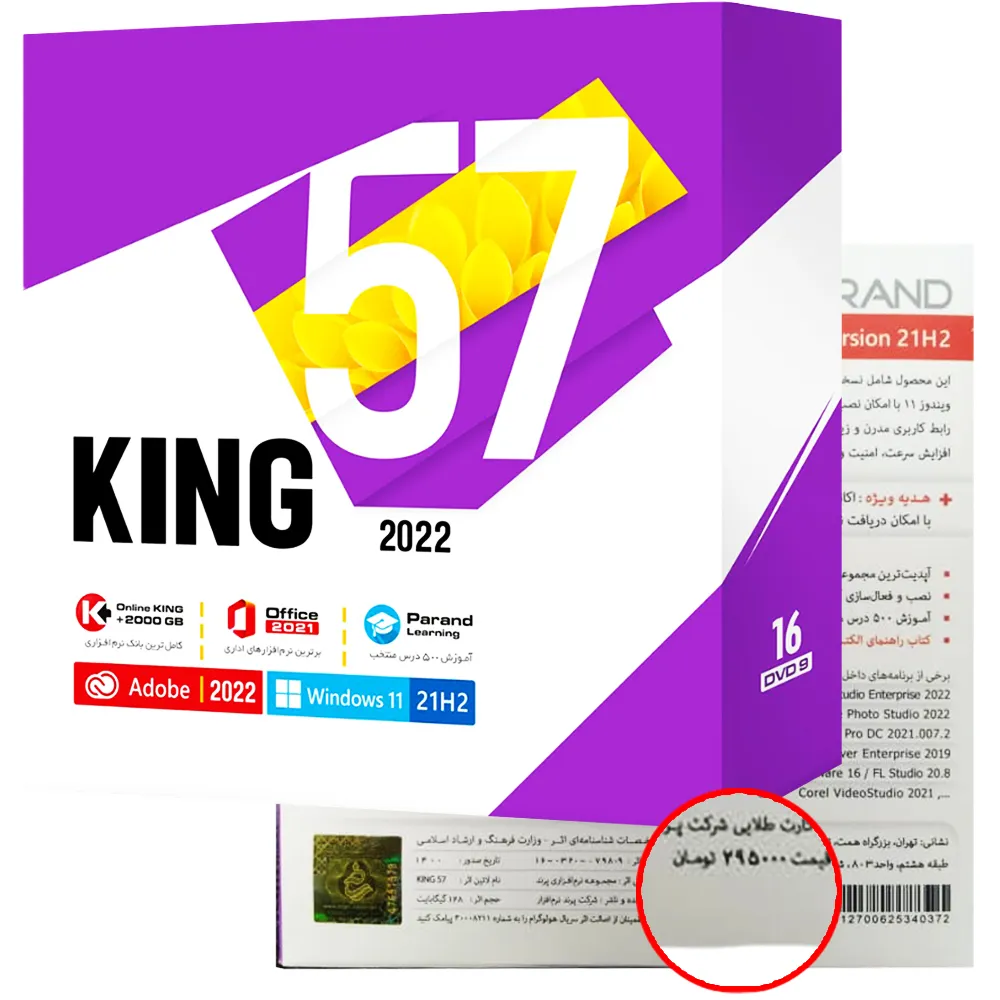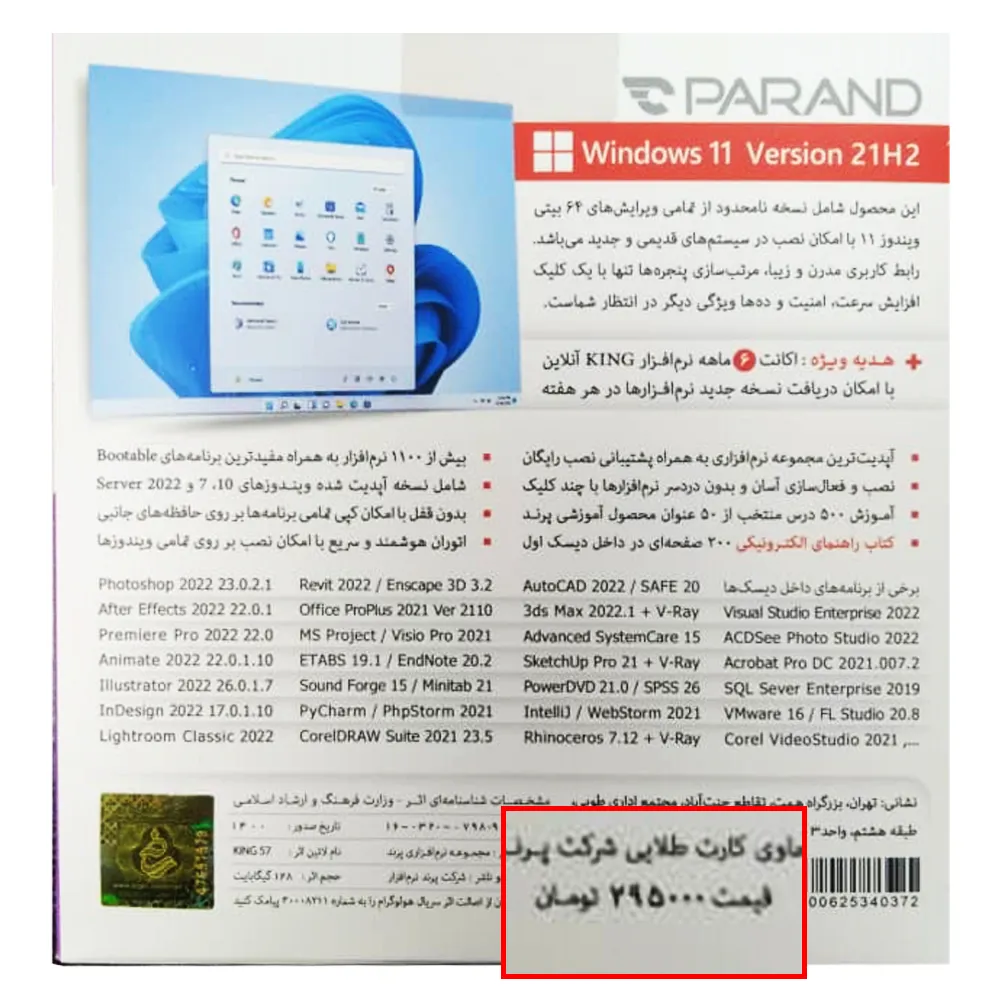 130011048مجموعهای جامع شامل بیش از ۱۱۰۰ نرمافزار کاربردی و تخصصی عرضه شده برای سال ۲۰۲۲ به همراه “پشتیبانی فنی رایگان”آپدیت بودن نرم افزارها و قرارگیری نسخه کاملا جدید از برنامه های پرکاربردی نظیرVisual Studio 2022 – Office Pro Plus 2021 – PyCharm 2021 – PhpStorm 2021 – IntelliJ 2021 – Driver Booster Pro 9 – Advanced SystemCare 15 – Rhino 7.12 + V-Ray – SketchUp 21.1 + V-Ray ,…به همراه کتاب راهنمای الکترونیکی ۲۰۰ صفحهای در داخل دیسک اول، شامل توضیح کاربرد کلیه برنامهها و مطالب آموزشی ارزشمند و کاربردیقرارگیری نسخه نهایی و نامحدود Windows 11 Version 21H2، شامل تمامی ویرایشهای Education ،Pro ،Home و Enterprise در ساختار ۶۴ بیتی با امکان نصب بر روی دستگاههای قدیمی و جدیدبه همراه نسخه نهایی Windows 10 Version 21H2، شامل تمامی ویرایشهای Education ،Pro ،Home و Enterprise در دو ساختار ۳۲ و ۶۴ بیتی با امکان نصب در هر دو حالت BIOS و UEFIقرارگیری Windows Server 2022، شامل کلیه ویرایشهای Standard و DataCenter به همراه فعال سازی دائمیشامل Windows 7 SP1 به همراه آخرین آپدیتها شامل کلیه ویرایشهای ۳۲ و ۶۴ بیتیشامل بسته نرمافزارهای اداری Microsoft Office Pro Plus 2021 به همراه MS Project 2021 و Visio 2021قرارگیری تمامی نرمافزارهای Adobe 2022 همراه با آخرین آپدیتها با پشتیبانی از زبان فارسی به صورت از پیش اکتیو شدهقرارگیری نسخه ۲۰۲۲ از مجموعه نرمافزارهای مهندسی شرکت Autodesk شامل:AutoCAD 2022 – 3ds Max 2022 – Revit 2022به همراه پلاگین قدرتمند V-Ray 5.20 برای Rhino 7 ،3ds Max 2022 و SketchUp 2021بدون داشتن قفل با امکان کپی تمامی برنامهها بر روی حافظههای جانبیتضمین نصب و فعال سازی ۱۰۰% نرمافزارها بر روی ویندوزهای ۱۱ و ۱۰نصب و فعالسازی بسیار آسان نرمافزارها تنها با چند کلیکاتوران اختصاصی با امکان تشخیص ساختار ویندوز و جستجو در متن توضیحات فارسی نرمافزارهاراهنمای تصویری فعالسازی کلیه نرمافزارها به زبان فارسیمجموعهای از معروفترین و پراستفادهترین نرمافزارهای بوتیبل جهت ویروس یابی، بازیابی رمز عبور فراموش شده ویندوز، پارتیشن بندی و… بدون نیاز به سیستم عاملشامل ۲۰ گیگ اکانت هدیه نرمافزار کینگ آنلاین جهت دریافت نسخه جدید برنامهها و نرمافزارهای درخواستی در هر هفتهقرارگیری ۵۰۰ درس منتخب از ۵۰ محصول آموزشی اینتراکتیو شرکت پرند شامل آموزش نرمافزارهای مهندسی، گرافیکی، ویدئویی، طراحی سه بعدی، برنامه نویسی، مهارتهای کار با کامپیوتر، سیستم عامل و…⭐ پخش سراسری ۲۰ دی – قیمت ۲۹۵۰۰۰ تومان ⭐