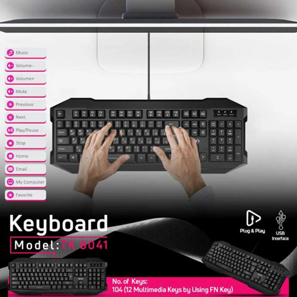 کیبورد تسکو مدل TK 8041 با طراحی ارگونومیک، کلیدهای نرم ممبران، عمر ۱۰ میلیون ضربه، اتصال USB، ۱۰۴ کلید استاندارد و ۱۲ کلید ترکیبی چندرسانهای، انتخابی دقیق و مقاوم برای تایپهای روزمره، کاری و آموزشی است.