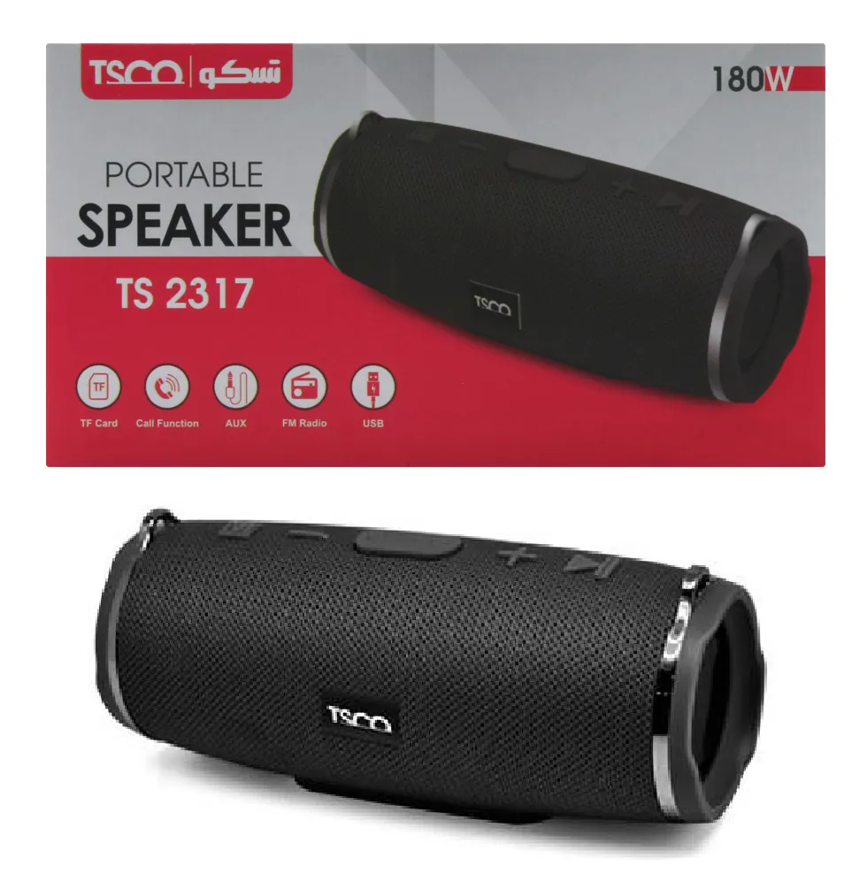 نقد و بررسی اجمالیاسپیکر بلوتوث TS 2317 محصولی از برند تسکو است که با طراحی استوانه ای شکل تولید و ساخته میشود. TS 2317 برای استفاده در سفر و طبیعت، یا گردش آخر هفته مناسب خواهد بود. این اسپیکر تسکو مدل TS 2317 با بهره مندی از رابط های بلوتوث ، جک 3.5 میلی متری ، USB و TF CARD به منبع پخش متصل میشود و شما را در گوش کردن به موسیقی دلخواهتان یاری می کند . حداکثر توان خروجی اسپيکر 2317 تسکو 6 وات بوده که مقدار قابل قبولی برای يک اسپيکر قابل حمل است. همچنین بر روی بدنهی از جنس کتان TS 2317 کليدهايی جهت مديريت موسيقی مشاهده می شود که علاوه بر زیبایی سهولت استفاده از آن را دو چندان کرده است. این اسپيکر قابل حمل تسکو مدل «TS 2317» انرژی خود را از يک باتری داخلی 1200mAH تأمين میکند.