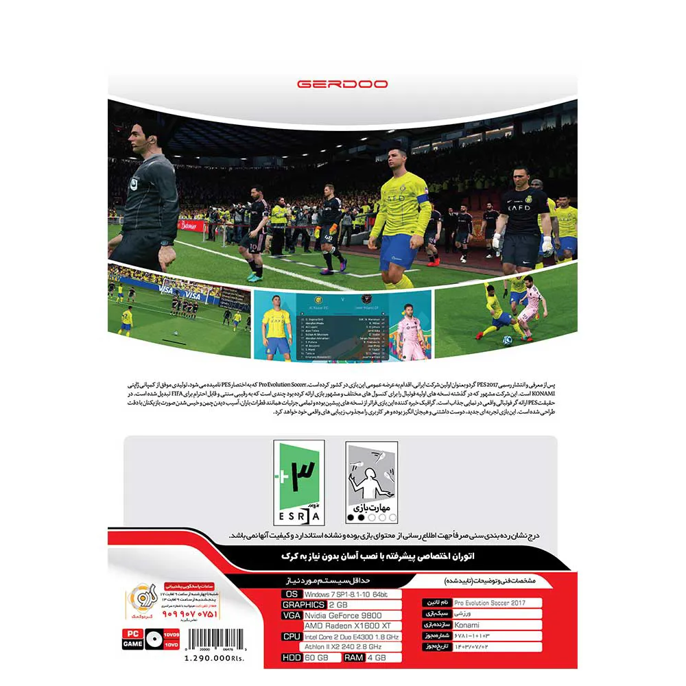 شماره مجوز بنیاد ملی بازی های رایانه ای: 10100-4373رده بندی سنی:3+سبک بازی: ورزشیمعرفی بازی:پس از معرفی و انتشار رسمی PES 2017 گردو بعنوان اولین شرکت ایرانی، اقدام به عرضه عمومی این بازی در کشور کرده است. Pro Evolution Soccer که به اختصار PES نامیده می شود، تولیدی موفق از کمپانی ژاپنی KONAMI است. این شرکت مشهور که در گذشته نسخه های اولیه فوتبال را برای کنسول های مختلف و مشهور بازی ارائه کرده بود چندی است که به رقیبی سنتی و قابل احترام برای FIFA تبدیل شده است. در حقیقت PES ارائه گر فوتبالی واقعی در نمایی جذاب است.گرافیک خیره کننده این بازی فراتر از نسخه های پیشین بوده و تمامی جزئیات همانند قطرات باران، آسیب دیدن چمن و خیس شدن صورت بازیکنان با دقت طراحی شده است. این بازی تجربه ای جدید، دوست داشتنی و هیجان انگیز بوده و هر کاربری را مجذوب زیبایی های واقعی خود خواهد کرد.لایسنس کامل لیگ های اروپایی از جمله بوندس لیگای آلمان، لیگ برتر انگلیس، لالیگای اسپانیا، لوشامپیونه فرانسه، سری آ ایتالیاو…به روز رسانی چهره های بازیکنان لیگ های مختلف به همراه لباس جدید تیم هااضافه شدن 40 استادیوم جدید به همراه مجموعه ای از توپ ها و کفش های جدیدبهبود کیفیت زمین چمن و ارتقا گیم پلی و گرافیگ بازیترکیب جدید تیم ها با بروزترین نقل و انتقالات سال 2022به همراه مسابقات جام جهانی 2022 و یورو 20221130010094