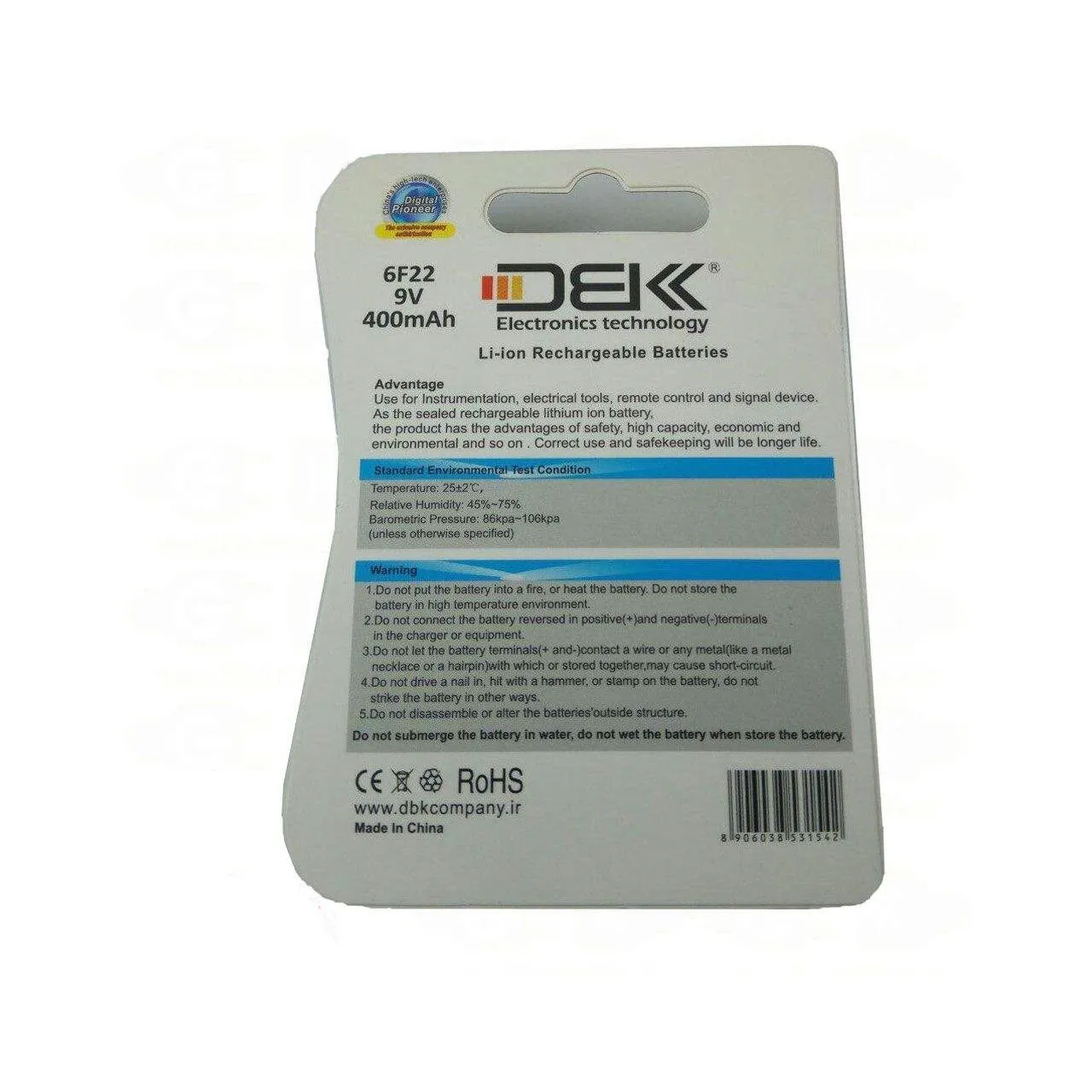مشخصات باتریتعداد باتری های موجود در پک1 عددنوع باتریکتابی 9Vولتاژ باتری9 ولتظرفیت باتری400 میلی آمپر ساعتنوع تکنولوژی باتریلیتیومیقابلیت شارژ مجدددارد