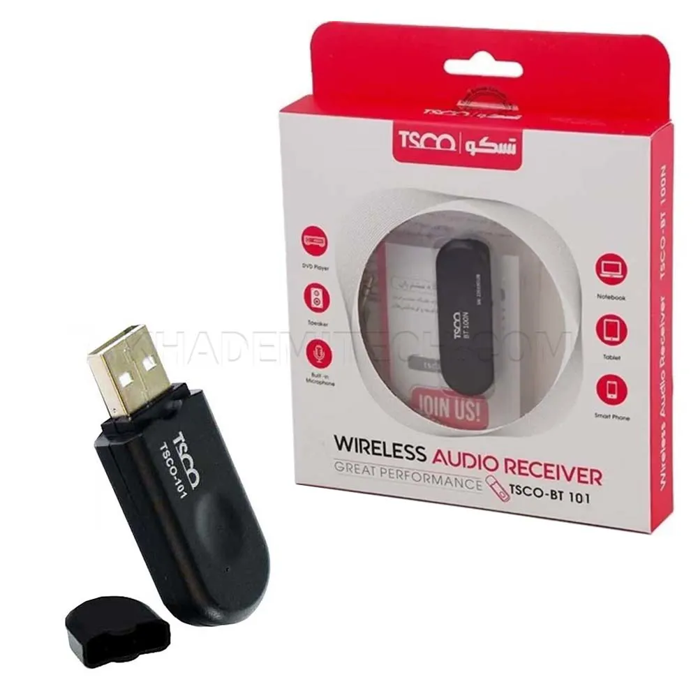 برای انتقال صدای تلفن همراه به اسپیکرها و هدست هایی که از بلوتوث پشتیبانی نمی کنند راحت ترین راه استفاده از یک دانگل بلوتوث است تا به راحتی و بدون استفاده از هیچ برنامه و نرم افزاری این عمل را انجام داد. دانگل بلوتوث تسکو مدل BT 101 یک محصول مناسب برای انتقال صدا می باشد این محصول از کیفیت ساخت بالایی برخوردار است علاوه بر آن به صورت پرتابل و بدون نیاز به نرم افزار قابل استفاده است برای استفاده از این محصول فقط کافیست آن را به منبع تغذیه (آداپتور -5v) متصل کنید و بعد از آن کابل AUX را به آن متصل کنید و یک سر کانکتور را به (اسپیکر) متصل کنید و در آخر با روشن کردن بلوتوث تلفن همراه خود و متصل شدن به دانگل موزیک مورد علاقه خود را پخش کنید.