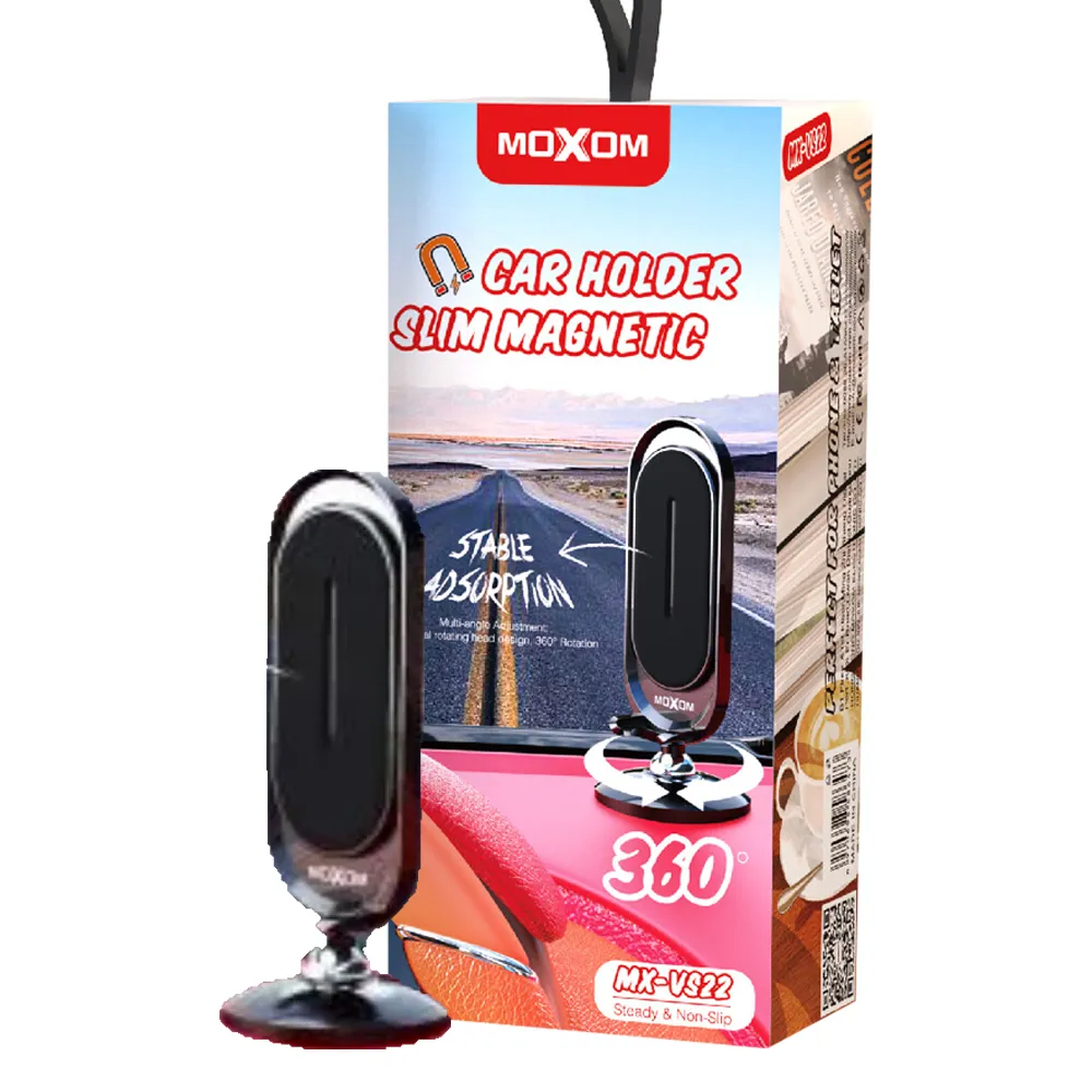هولدر MX-VS22 یک هولدر مگنتی موبایل است که با طراحی کاربردی و زیبا این اطمینان را به شما میدهد که با اطمینان خاطر رانندگی کنید. هولد ماشینی مخصوص موبایل موکسوم قابلیت چرخش 360 درجه دارد و یک قطعه مگنت نیز همراه دارد برای گوشی هایی که خاصیت مگنت ندارند. این قطعه به پشت موبایل می پسبد و خاصیت مگنت به موبایل مید هد تا به راحتی موبایل روی هولدر قرار بگیرد.